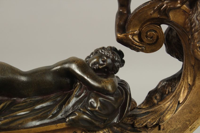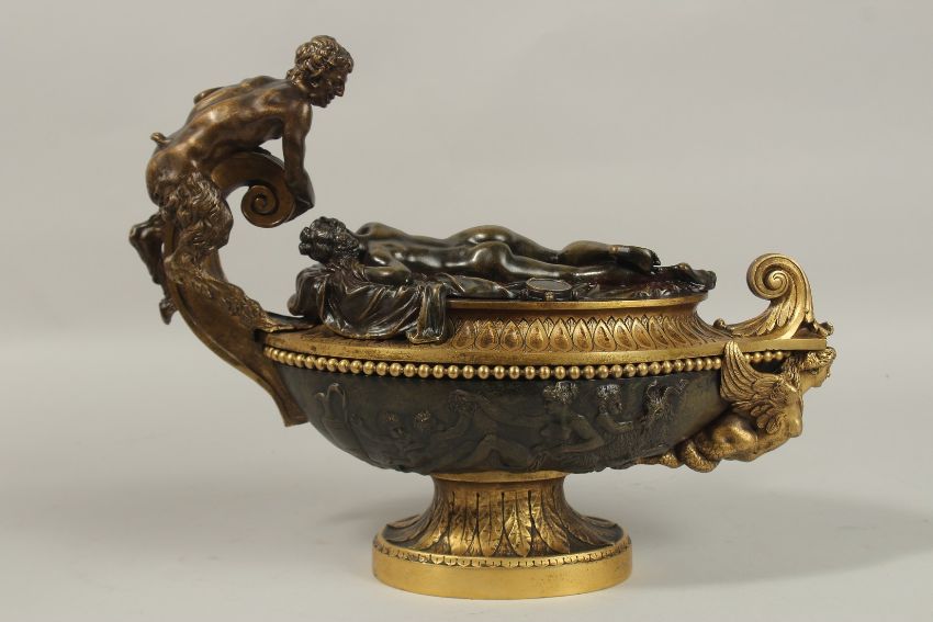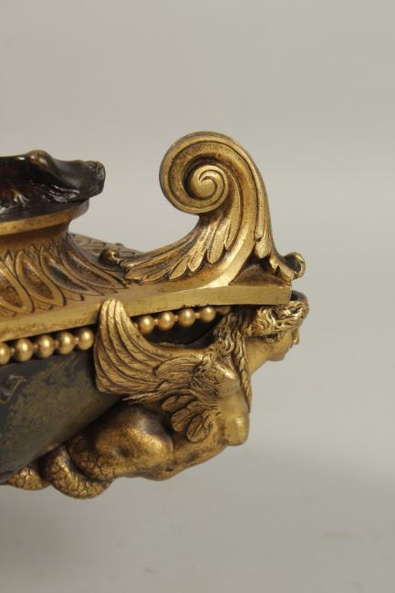 A GOOD LOUIS XVI DESIGN BRONZE AND ORMOLU EGYPTIAN LAMP with Satyr handle and sleeping nude.
