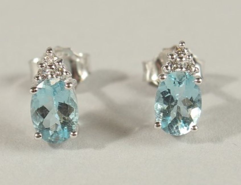 A GOOD PAIR OF 18CT WHITE GOLD, AQUAMARINE AND DIAMOND EAR STUDS.