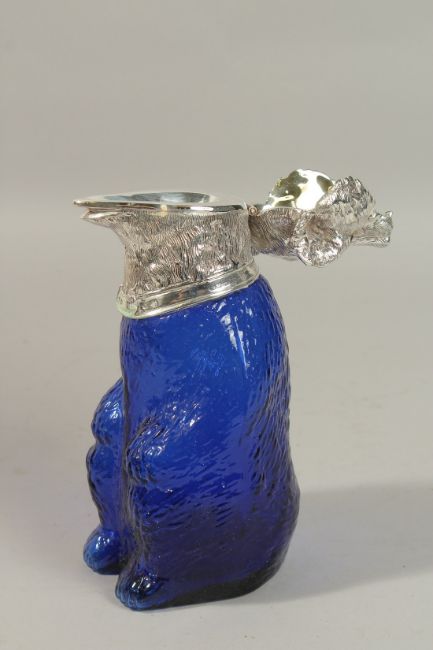 A BLUE GLASS AND PLATE NOVELTY BEAR CLARET JUG.