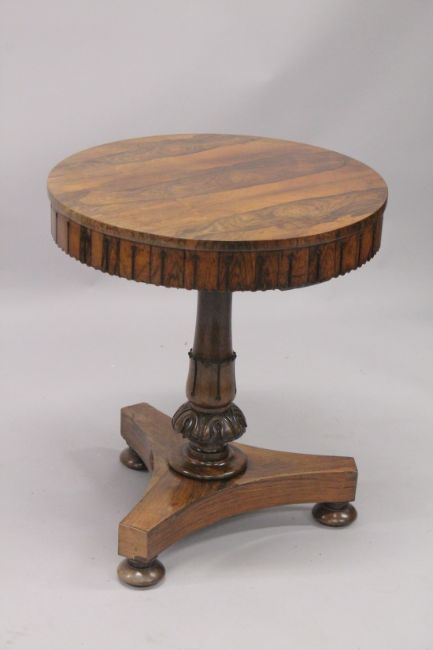 A GOOD LATE REGENCY ROSEWOOD CIRCULAR SMALL DRUM TABLE with figured top, centre column support and tripod base.