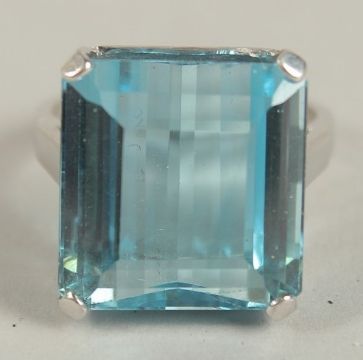 A LARGE 18CT WHITE GOLD SINGLE STONE AQUAMARINE RING.