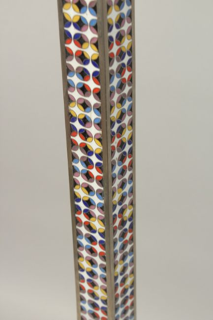 AN UNUSUAL AND HIGHLY DECORATIVE ENAMEL FLOOR STANDING LAMP, each of its four sides and curving legs with colour oval enamel panels, initialled to the underside.
