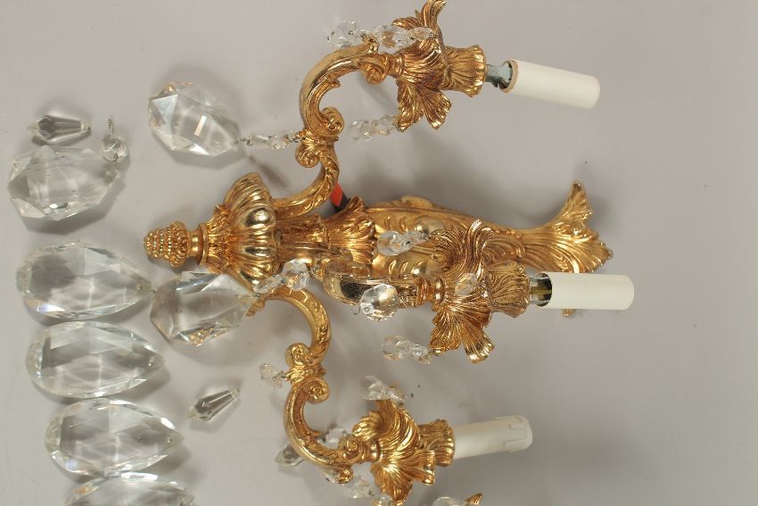 A PAIR OF GILT METAL THREE LIGHT WALL SCONCES with cut glass prism drops.