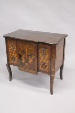 AN 18TH CENTURY FRENCH BREAKFRONT WALNUT AND MARQUETRY COMMODE, with two deep drawers, inlaid with musical trophies, the sides with parquetry decoration, on cabriole legs.