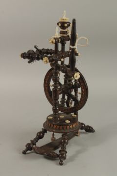 A MINIATURE 19TH CENTURY CARVED WOOD AND BONE SPINNING WHEEL.