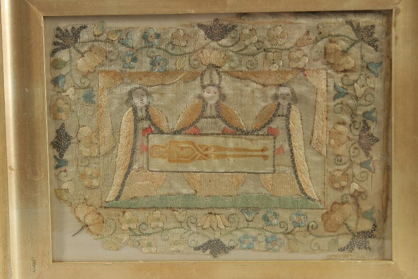 A 17TH CENTURY SILK TURIN SHROUD, framed and glazed.