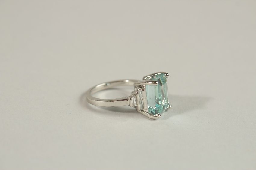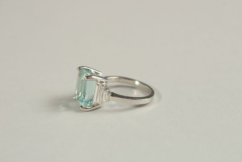 A PLATINUM 5.5CT OCTAGONAL AQUAMARINE AND DIAMOND RING.