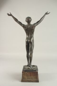 A GOOD BRONZE OF A NUDE MAN, standing arm upright.