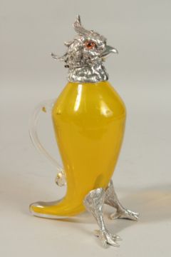 AN AMBER GLASS AND PLATE NOVELTY COCKATOO CLARET JUG.