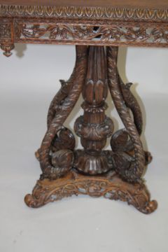 AN ANGLO INDIAN PADOUK PEDESTAL TABLE, late 19th century with an egg and dart moulded rectangular top, floral carved and pierced frieze, well carved central supports on a carved concave sided platform base.