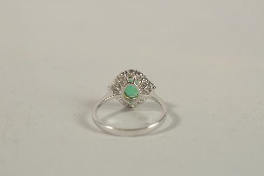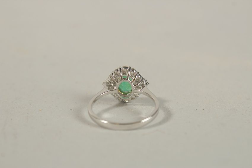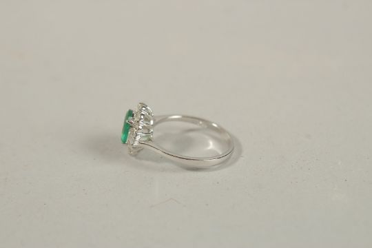 AN 18CT WHITE GOLD OVAL EMERALD AND DIAMOND CLUSTER RING.