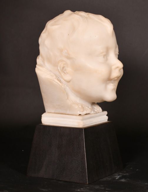 Late 19th Century Continental School, a head study of a laughing child, alabaster, on a wooden base, 9" (23cm) high excluding the base.