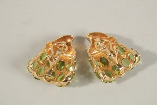 A PAIR OF 18CT GOLD TWO ROWS OF PERIDOT EARRINGS.