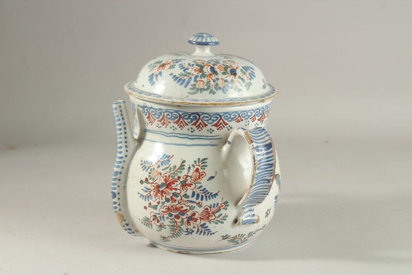 A VERY FINE 18TH CENTURY BRISTOL DELFT POSSET POT AND COVER, painted with flowers in mainly blue, the body with two handles and moving spout.