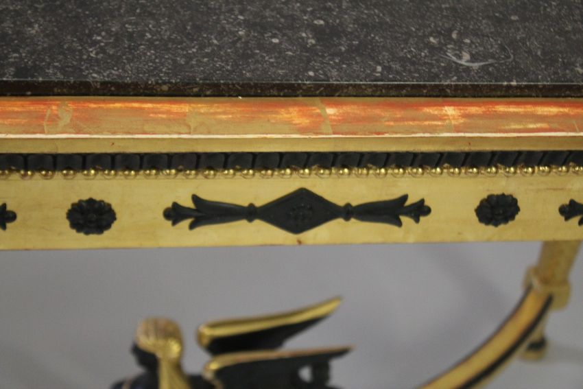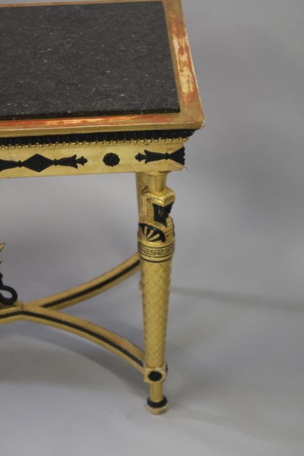 A GOOD LATE 19TH/EARLY 20TH CENTURY EGYPTIAN REVIVAL GILTWOOD CENTRE TABLE, with a fossilised black marble inset top, overhanging border with ebonised moulding, the frieze with ebonised decoration, supported on four Egyptian caryatid legs, the cross stretcher with carved sphinx. 3ft 8ins long x 2ft 0.5ins wide x 2ft 4ins high.