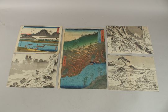 HIROSHIGE I UTAGAWA (1797-1858): FROM THE SERIES OF TOKAIDO ROAD AND THE VIEWS OF 60 ODD PROVINCES, & KATSUSHIKA HOKUSAI (1760-1849): FROM THE SERIES OF ONE HUNDRED VIEWS OF MT. FUJI; five mid to late 19th century original Japanese woodblock prints, (5).