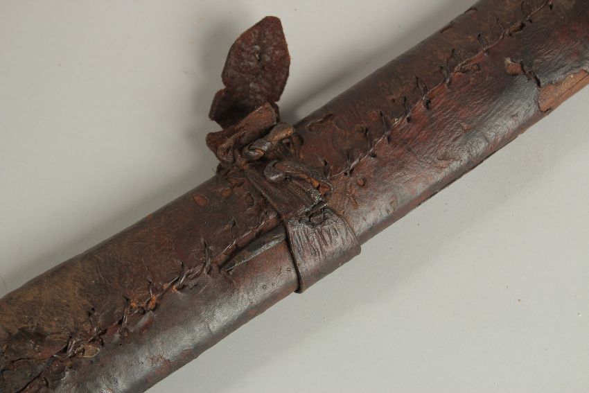AN EARLY ISLAMIC POSSIBLY OTTOMAN SWORD, in leather overlaid scabbard, 71cm long overall.