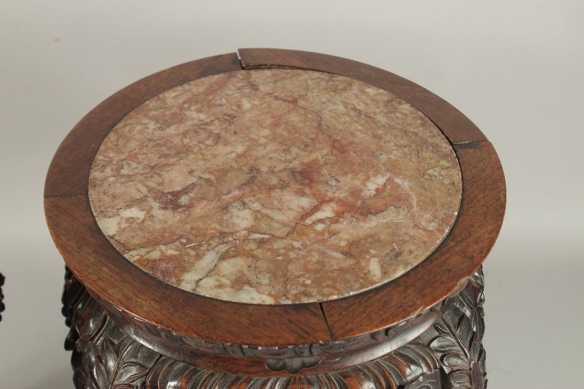 A PAIR OF 19TH CENTURY CHINESE MARBLE INSET HARDWOOD STANDS, with carved and pierced frieze on stretchered legs terminating in claw feet, 44cm high, tops 28cm diameter.