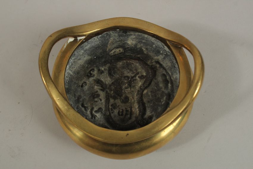 AN 18TH-19TH CENTURY CHINESE GILT BRONZE CENSER ON HARDWOOD STAND, with character mark to base, the interior with dragon design, censer 12cm wide.