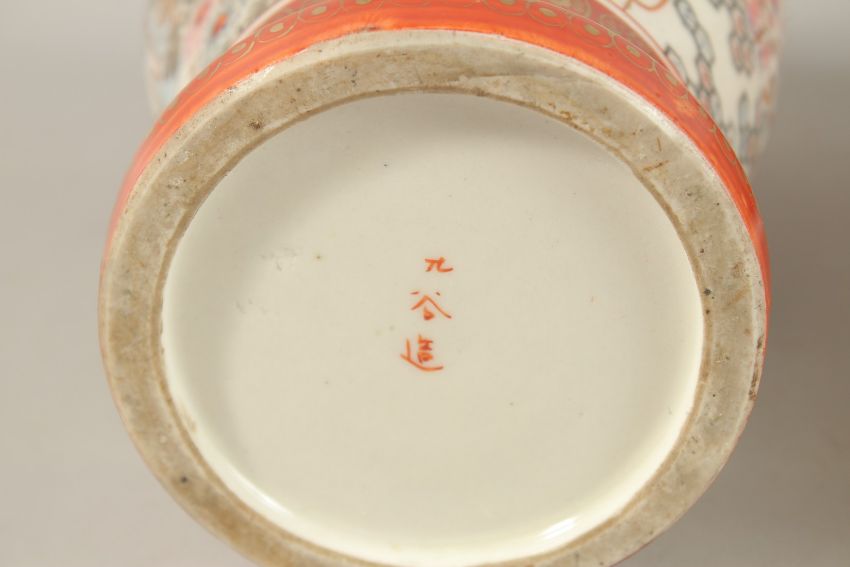 A PAIR OF JAPANESE KUTANI PORCELAIN TWIN HANDLE VASES, painted with panels of figures and flora, with fine gilt highlights and decorative motifs, each vase signed to base, 34cm high.