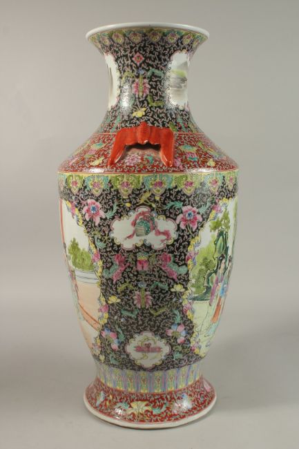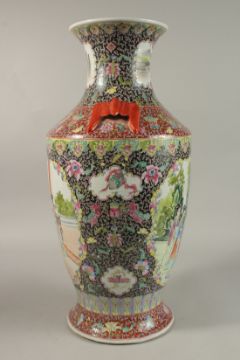 A LARGE CHINESE FAMILLE NOIR / ROSE PORCELAIN VASE, with twin bat formed handles, painted with two large panels of figures as well as landscapes and precious objects, decorated all over with foliate designs and longevity symbols, character mark to base, 55cm high.