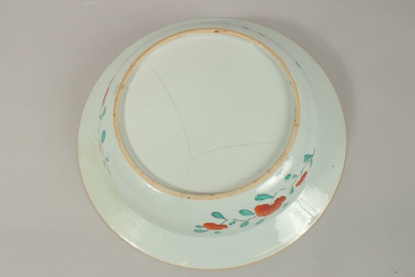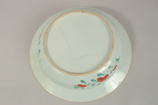 A LARGE CHINESE FAMILLE ROSE PORCELAIN BOWL, painted with phoenix and fish, further decorated with gilt highlights, 42cm diameter.