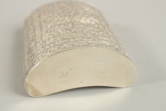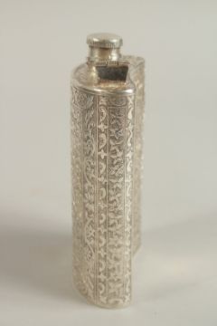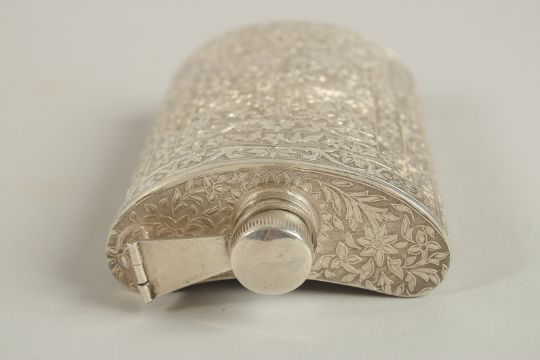 A 19TH CENTURY INDIAN ENGRAVED SILVER FLASK, with fine floral designs, 13.5cm high.