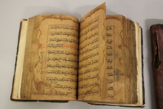 A EARLY ISLAMIC POSSIBLY PERSIAN HANDWRITTEN QURAN, and another printed Quran, dated 1300 ad, (2).