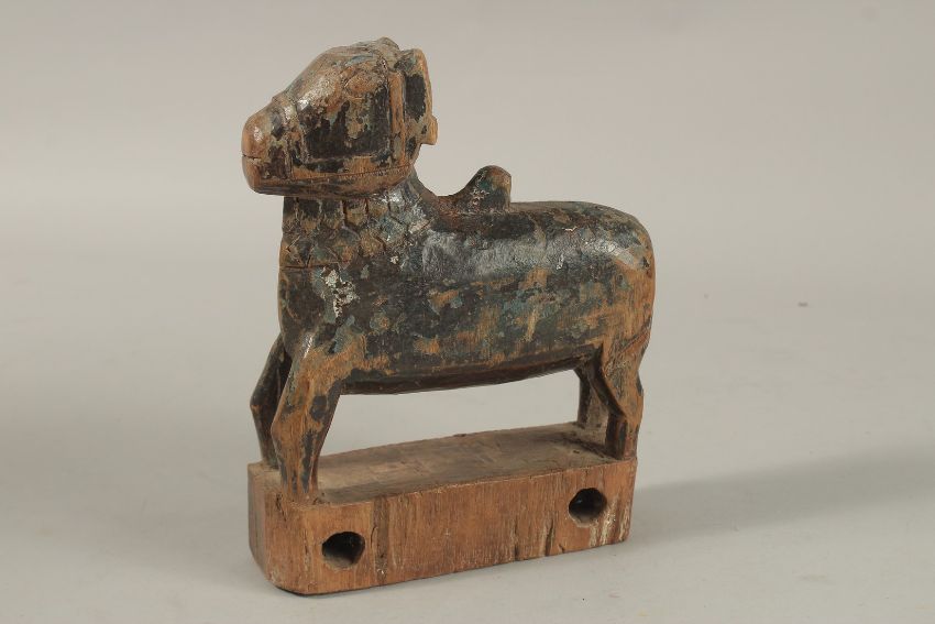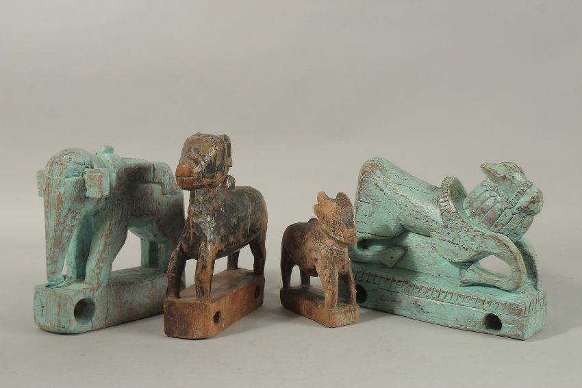 FOUR INDIAN CARVED WOOD ANIMAL TOYS OR FITTINGS - possibly from a temple, (4).