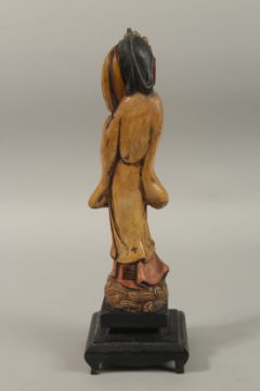 A CHINESE CARVED POTTERY FIGURE, mounted to a hardwood base, 35cm high.