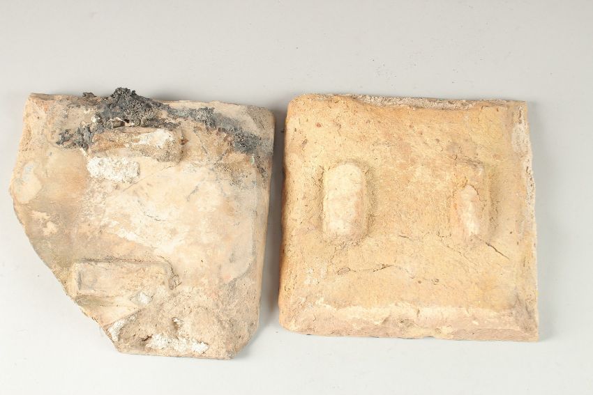 TWO 19TH CENTURY PERSIAN QAJAR YELLOW GLAZED TILES, largest 18.5cm x 18.5cm.