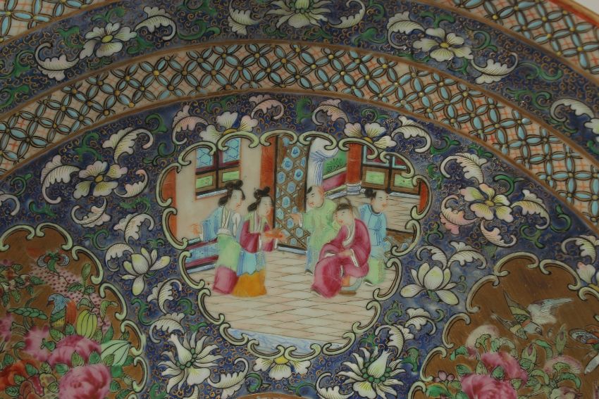 A VERY FINE CHINESE CANTON ISLAMIC MARKET PORCELAIN CHARGER, beautifully decorated with central calligraphic panel, emanating with further painted panels of figures and flora with birds and butterflies, on a blue ground with finely enamel painted lotus flower motifs and heightened with gilded highlights, 40.5cm diameter.