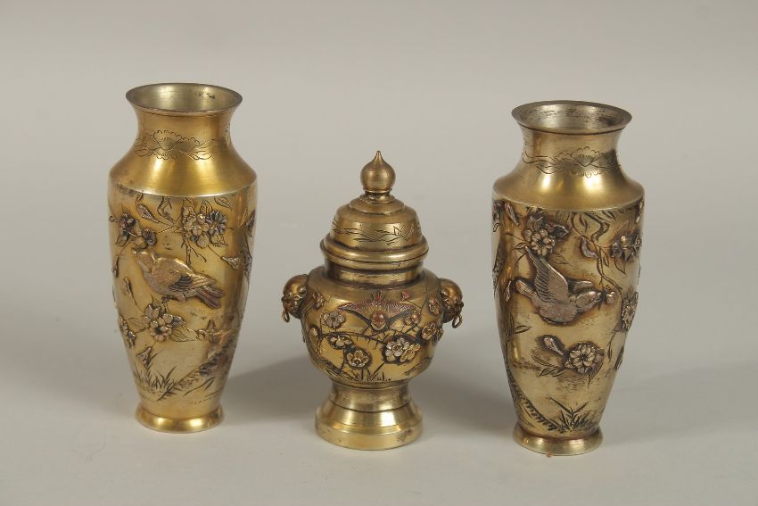 A JAPANESE MIXED METAL PAIR OF VASES AND LIDDED POT, each piece with finely engraved overlaid birds and flora, vases 12.5cm high, pot 11cm high, (3).