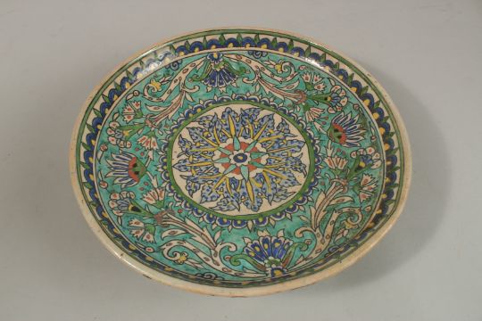 A FINE LARGE EARLY 20TH CENTURY PALESTINIAN JERUSALEM GLAZED POTTERY CHARGER, 30cm wide.