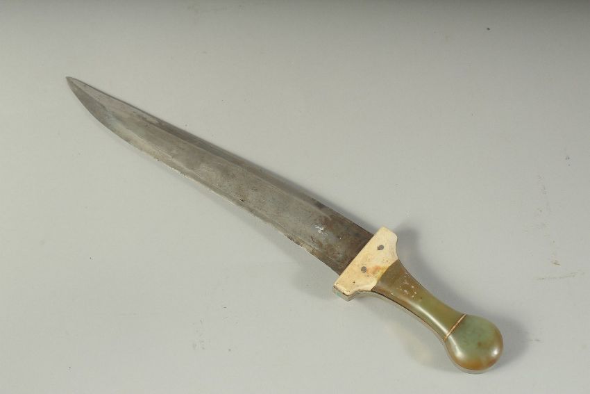 A FINE AND LARGE INDIAN JADE AND BONE HILTED DAGGER, with watered steel blade. 40cm long.