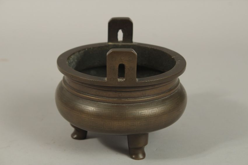 A CHINESE BRONZE TWIN HANDLE TRIPOD CENSER, with longevity symbols, 12cm wide.