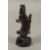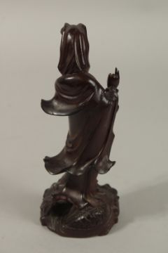 A CHINESE CARVED WOOD FIGURE OF GUANYIN, stood upon a beast with inset eyes and teeth, 15.5cm high.