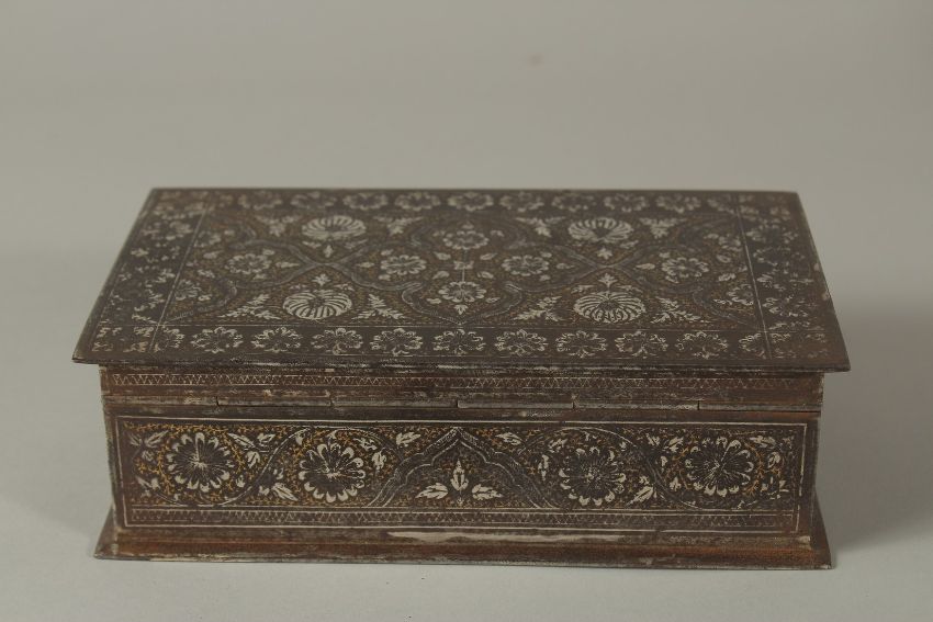 A FINE 19TH CENTURY NORTH INDIAN KOFTGARI SILVER AND GOLD INLAID STEEL BOX, 18cm x 10.5cm.