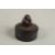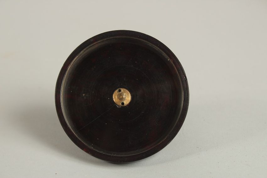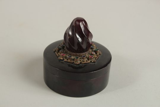 A FINE 19TH CENTURY CIRCULAR JEWELLERY BOX WITH CHERRY AMBER FINIAL, the lid with metal mount with inset stones, 8cm diameter.