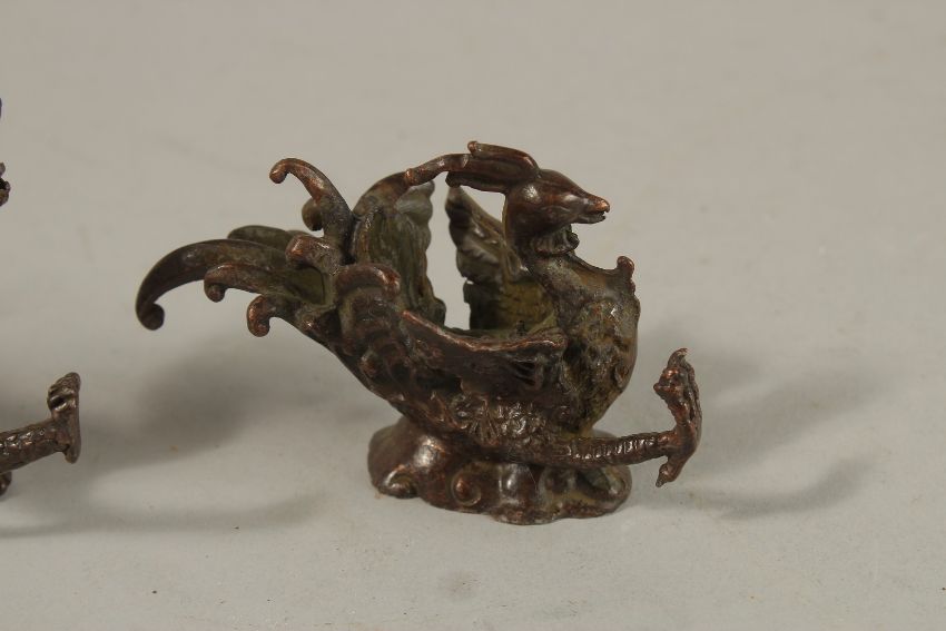 TWO BRONZE OKIMONOS OF A DRAGON AND PHOENIX, (2).