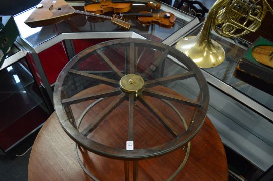 An unusual glass and brass coffee table, the top formed as a wheel.
