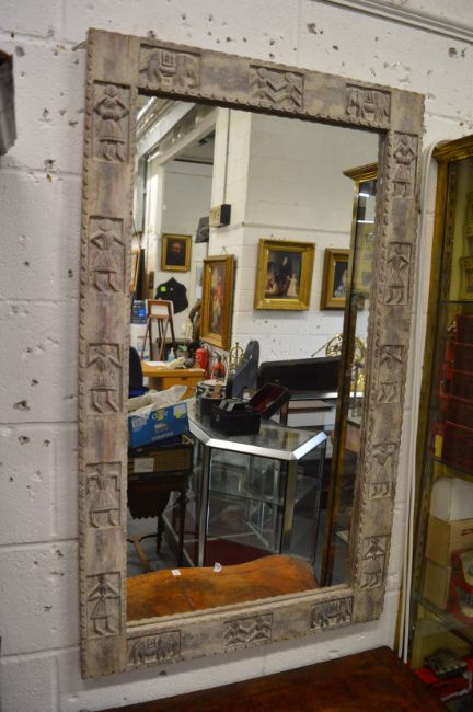 An unusual pair of mirrors, the limed wood frames carved with figures and animals.