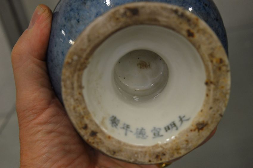 A Chinese pedestal bowl and cover with mottled blue glazed decoration.