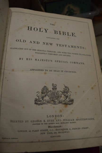 A box of books to include two bibles.