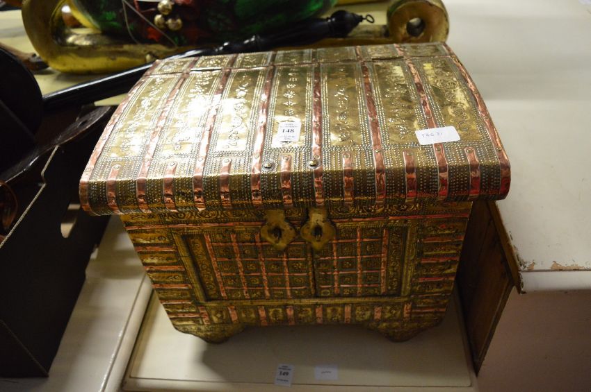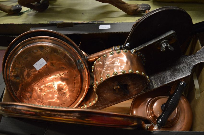 Copper and brass ware to include storage box, bed warming pan, kettle etc.