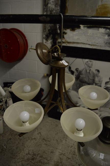 Modern five branch chandelier with opaque glass shades.