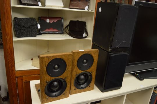 A pair of large floor standing speakers and three other pairs of speakers.