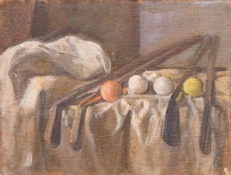 Georges Weissbort (1928-2013), a pair of still life works featuring golfing equipment and the other with fruit, oil on canvas laid down, 10" x 13" (25 x 33cm), unframed, (2).