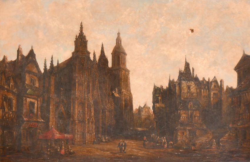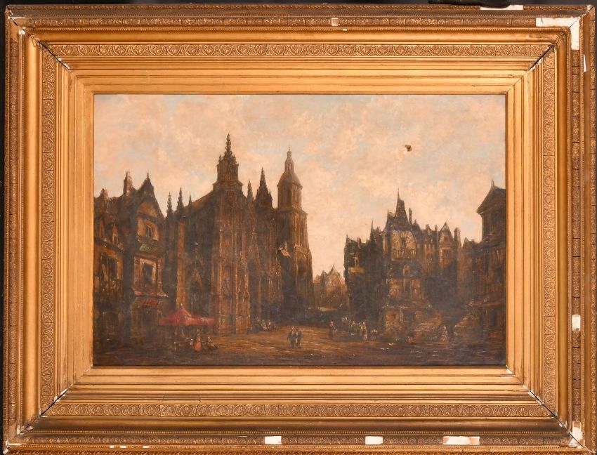 H. Schafer (19th Century), 'Cathedral at Evreux, France', figures in a cathedral square, oil on canvas, inscribed verso, 20 x 30" (51 x 76cm), a/f.
