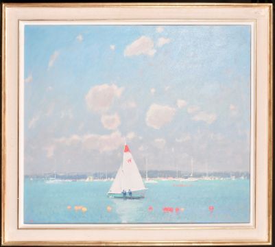Stephen Brown (b. 1947), 'The Wayfarer', view of a sailboat between a line of buoys in a bay, oil on canvas, signed with initials, 30" x 34" (76 x 86cm).